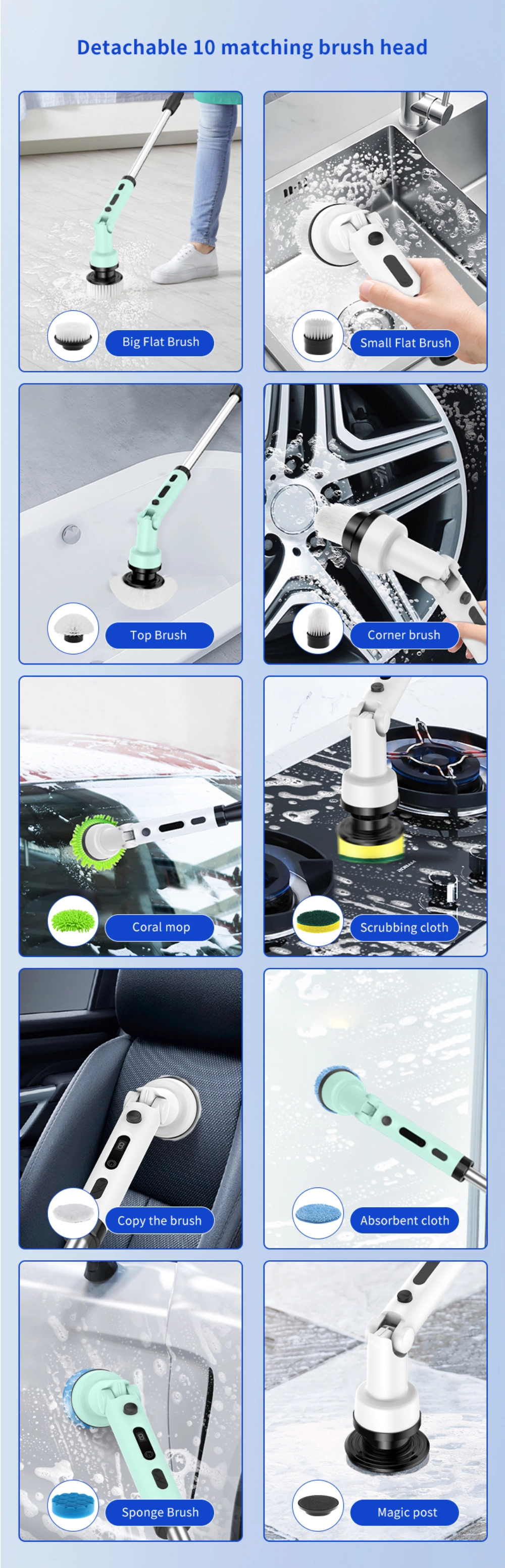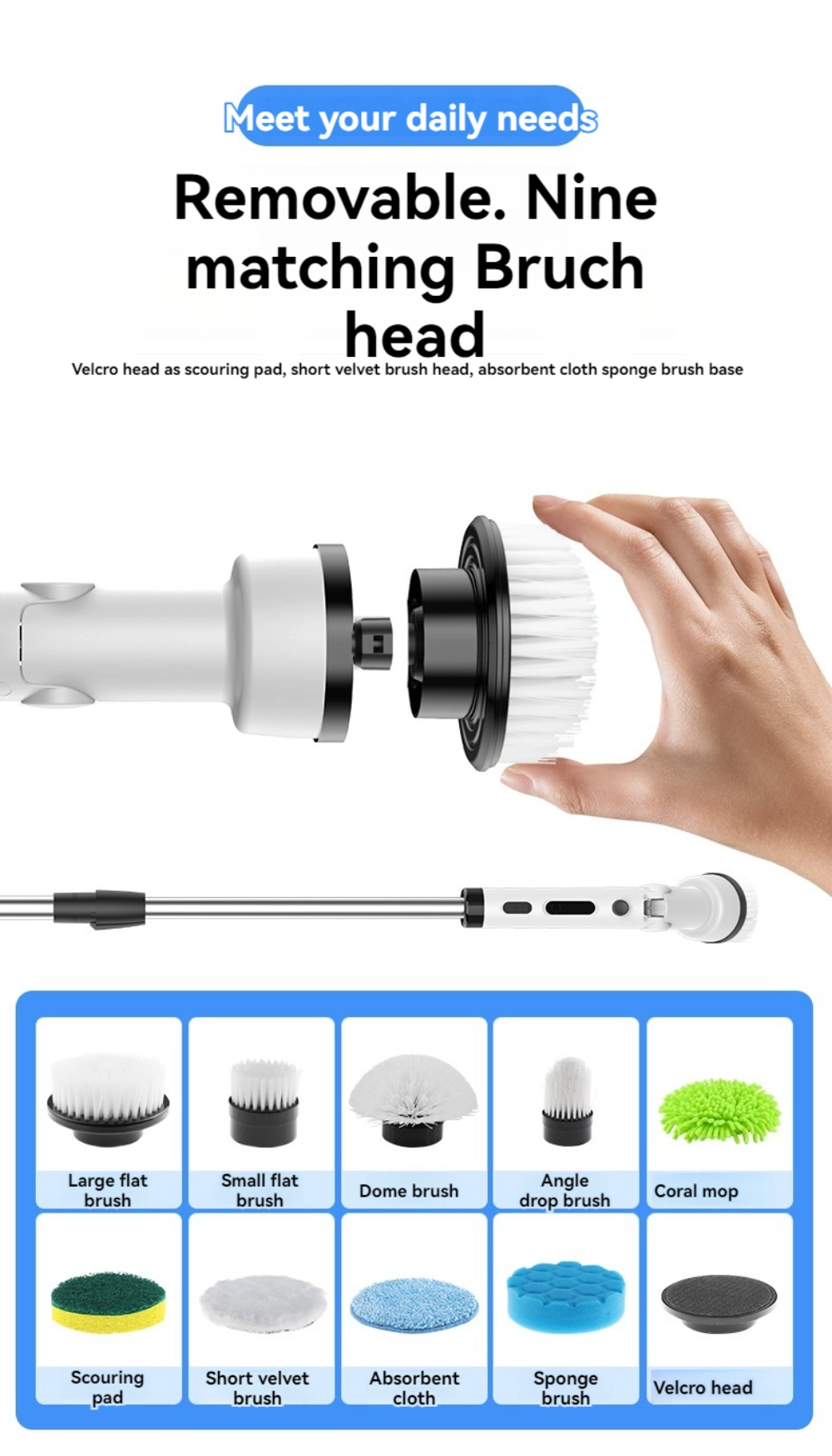 9 Replaceable Brush Heads – Meet all cleaning needs from deep scrubbing to delicate surface care.